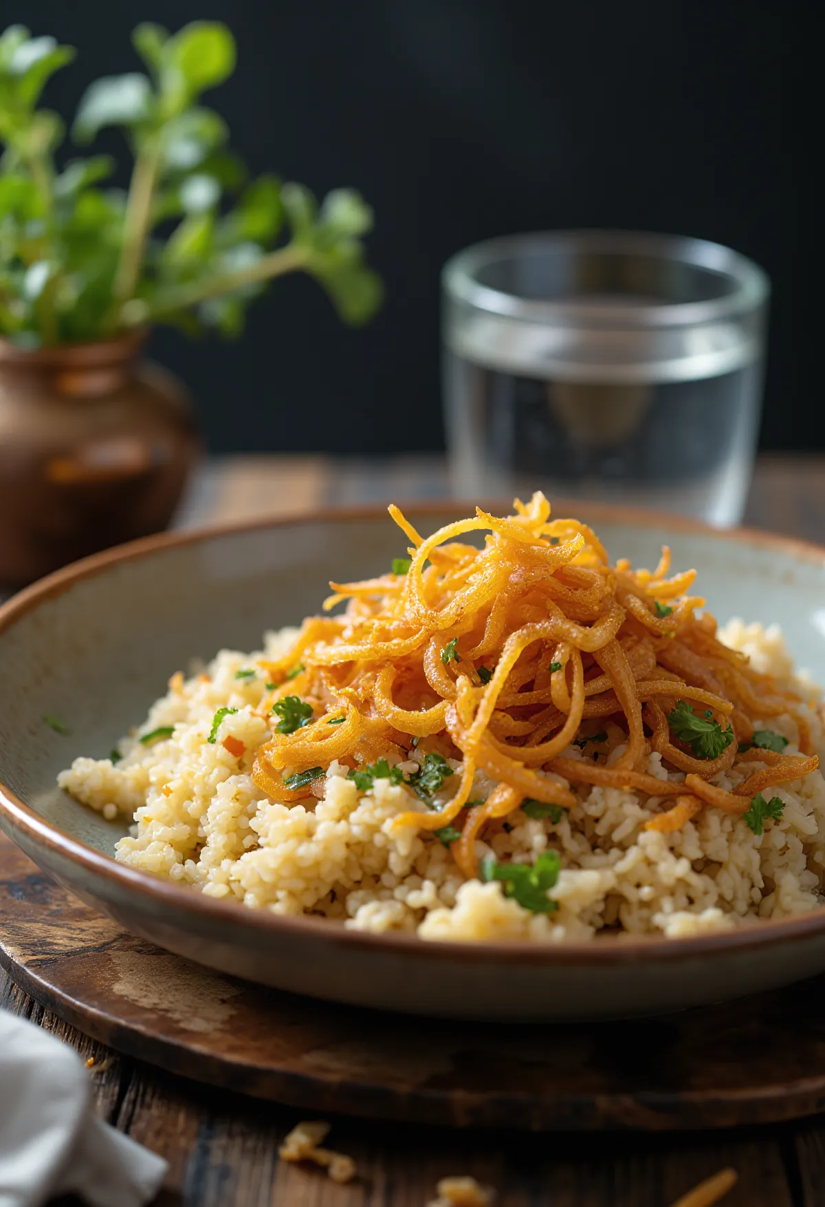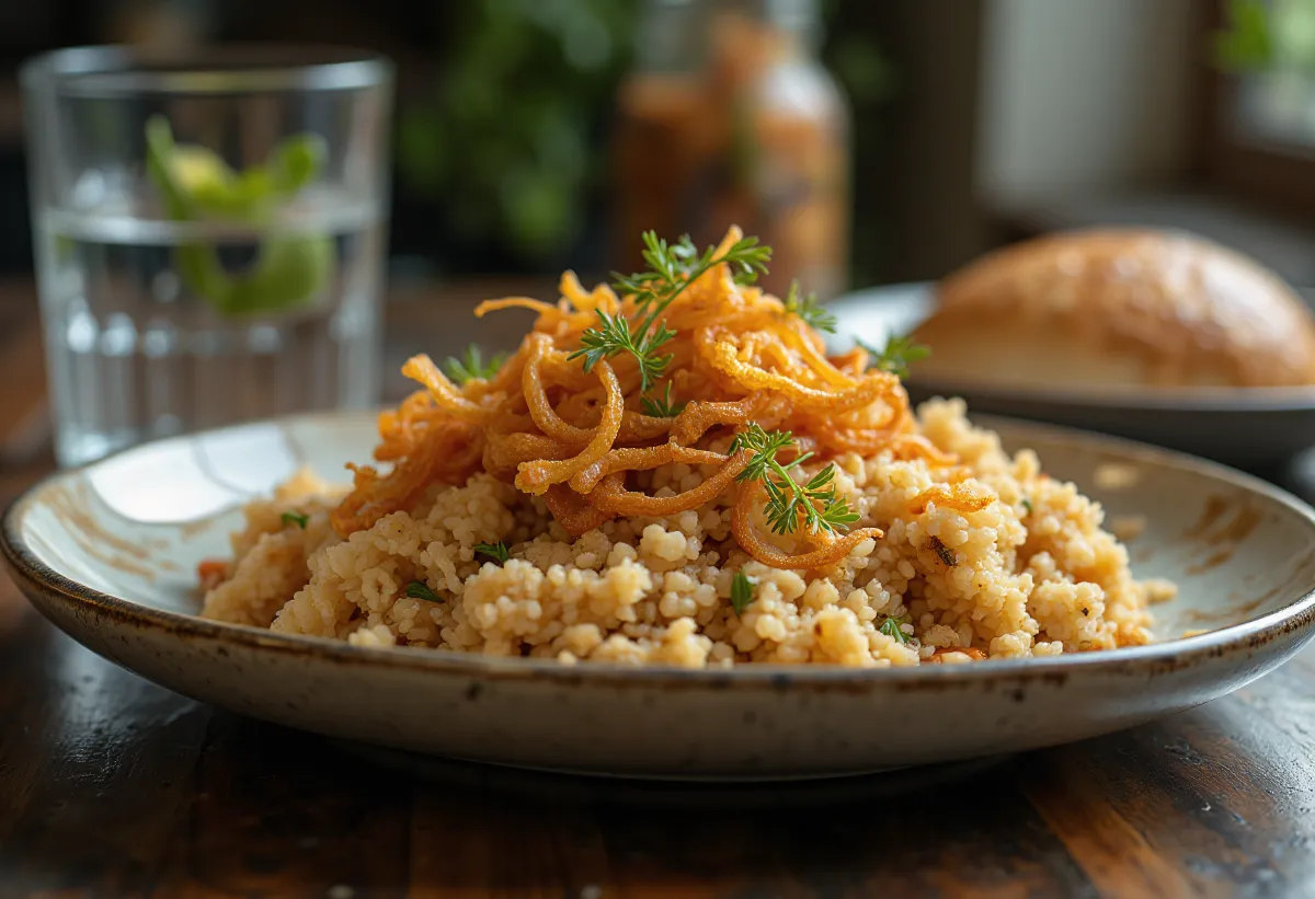 Душа Муџадаре је лук, али у овој верзији главну улогу игра игра текстура. 'Круна од хрскавог лука' (crispy onions) посута преко меког, зачињеног булгура са сочивом није само украс. Лук уваљан у брашно и испржен у дубоком уљу до хрскавости експлодира у устима као слатко-слана бомба укуса, стварајући контраст са основним јелом земљаног укуса.