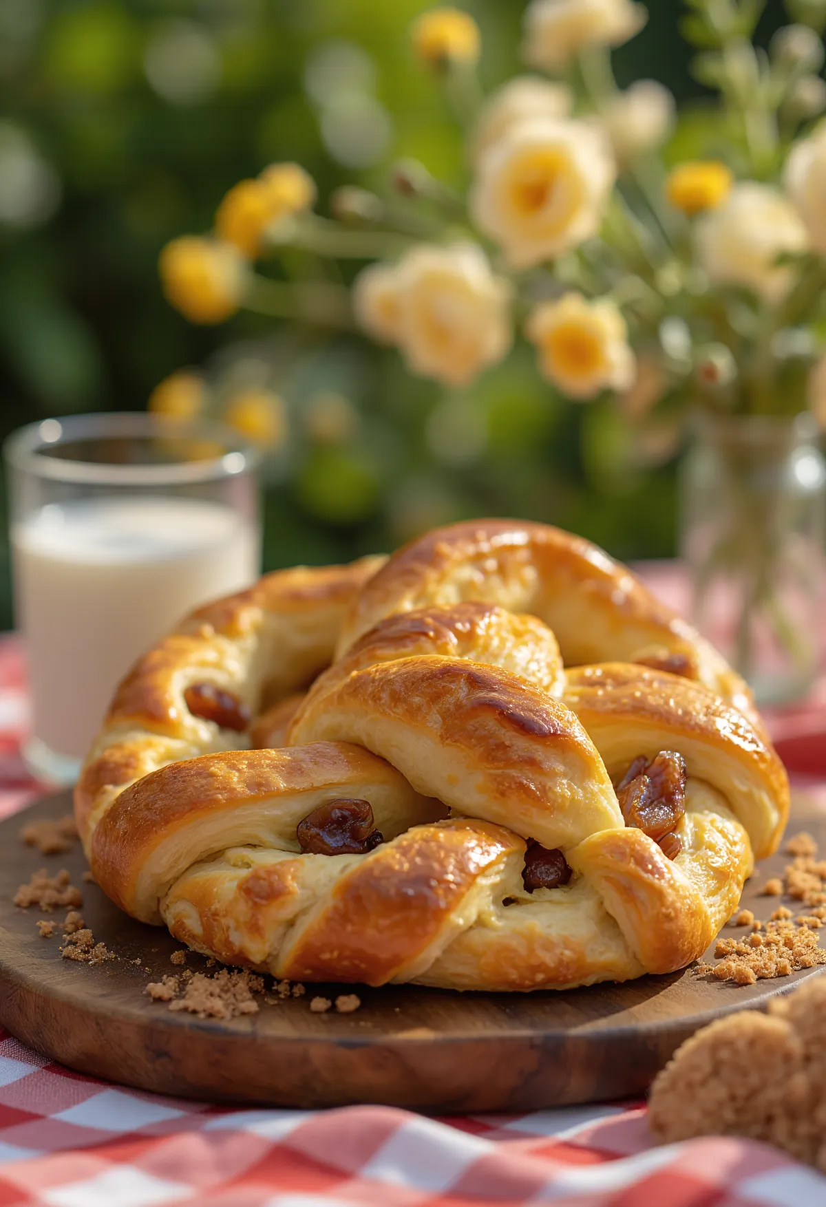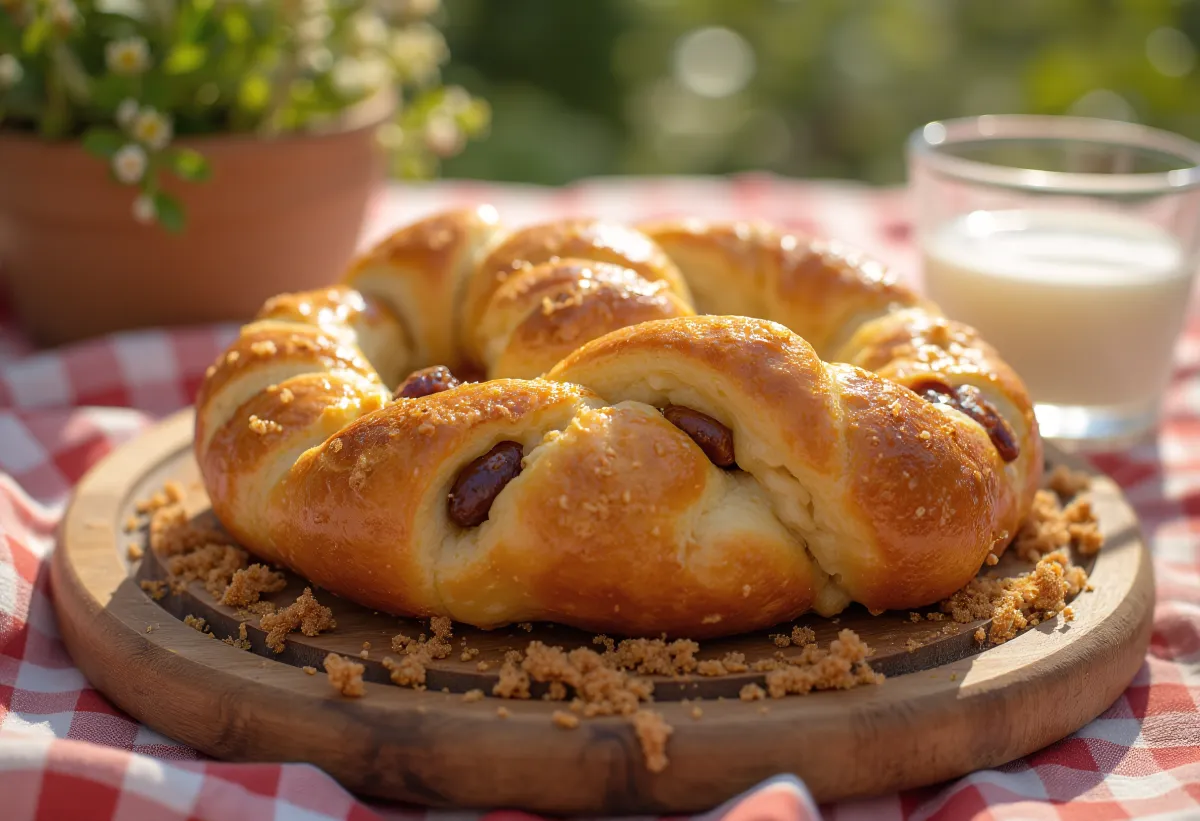 Покривено оставите да одмори још 15 минута. Премажите другим умућеним јајетом и поспите смеђим шећером.